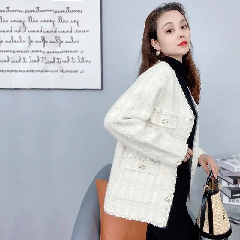 Женское Короткое шерстяное пальто в клетку, с круглым вырезом