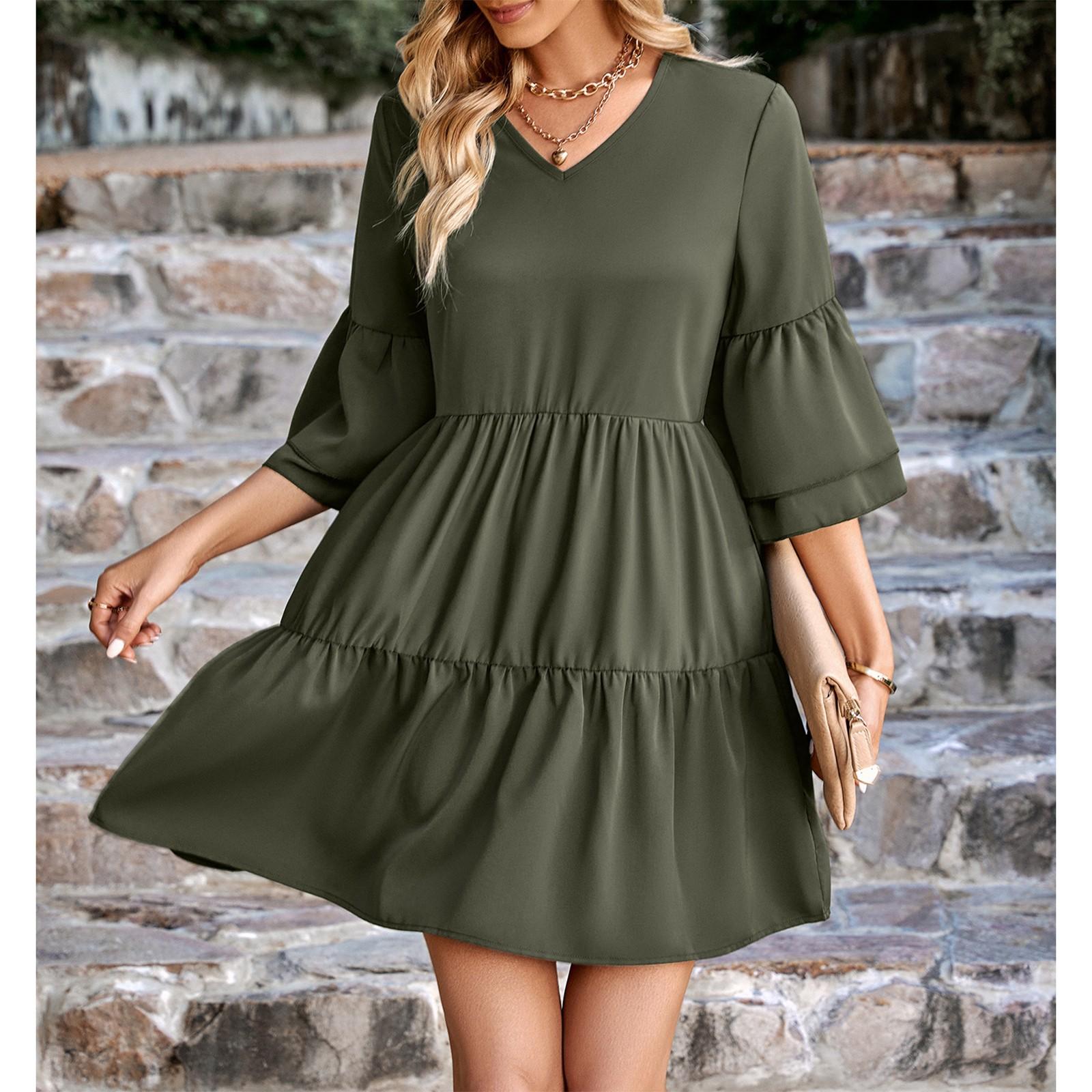 Женское Модное Летнее Однотонное Платье с V-образным Вырезом, Свободным Кроем и Короткими Рукавами M