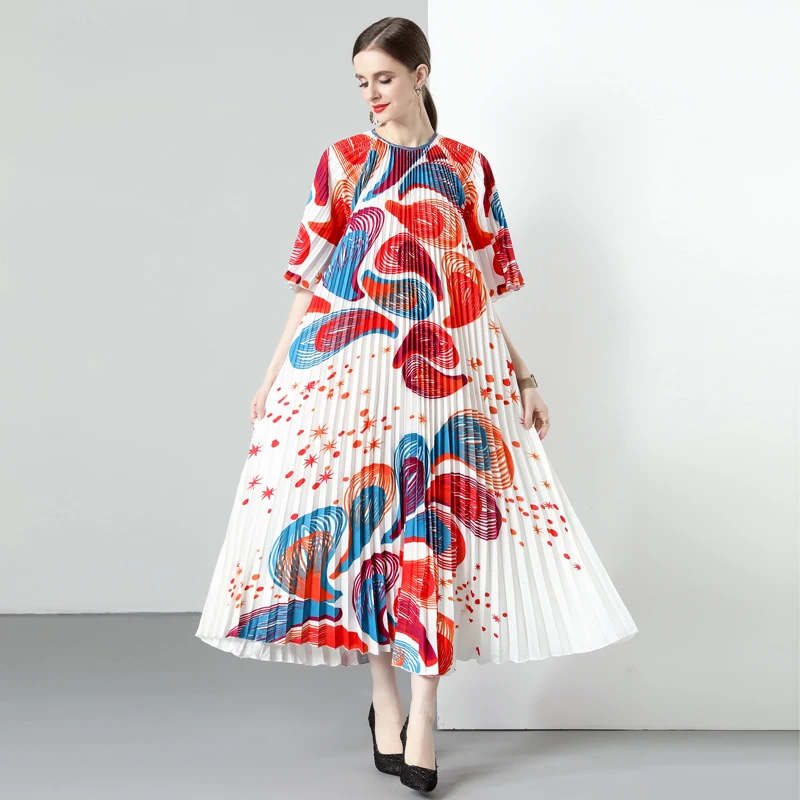 Женское Плиссированное длинное платье миаке, свободное летнее платье большого размера с круглым вырезом, поясом и принтом, яркое Макси-платье