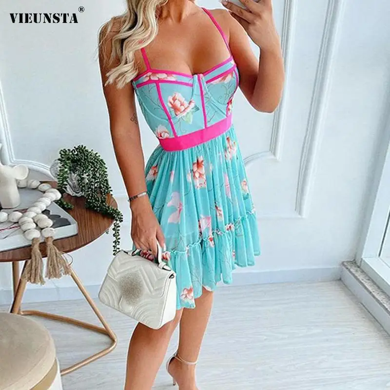 Женское Плиссированное мини-платье на бретельках, платье с цветочным принтом, открытыми плечами, открытой спиной и оборками, весна-лето 2022