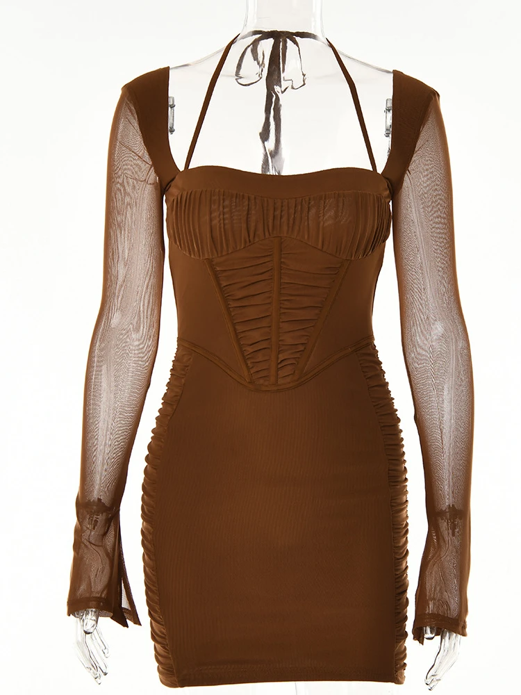 Женское Сетчатое мини-платье с квадратным вырезом, длинным рукавом