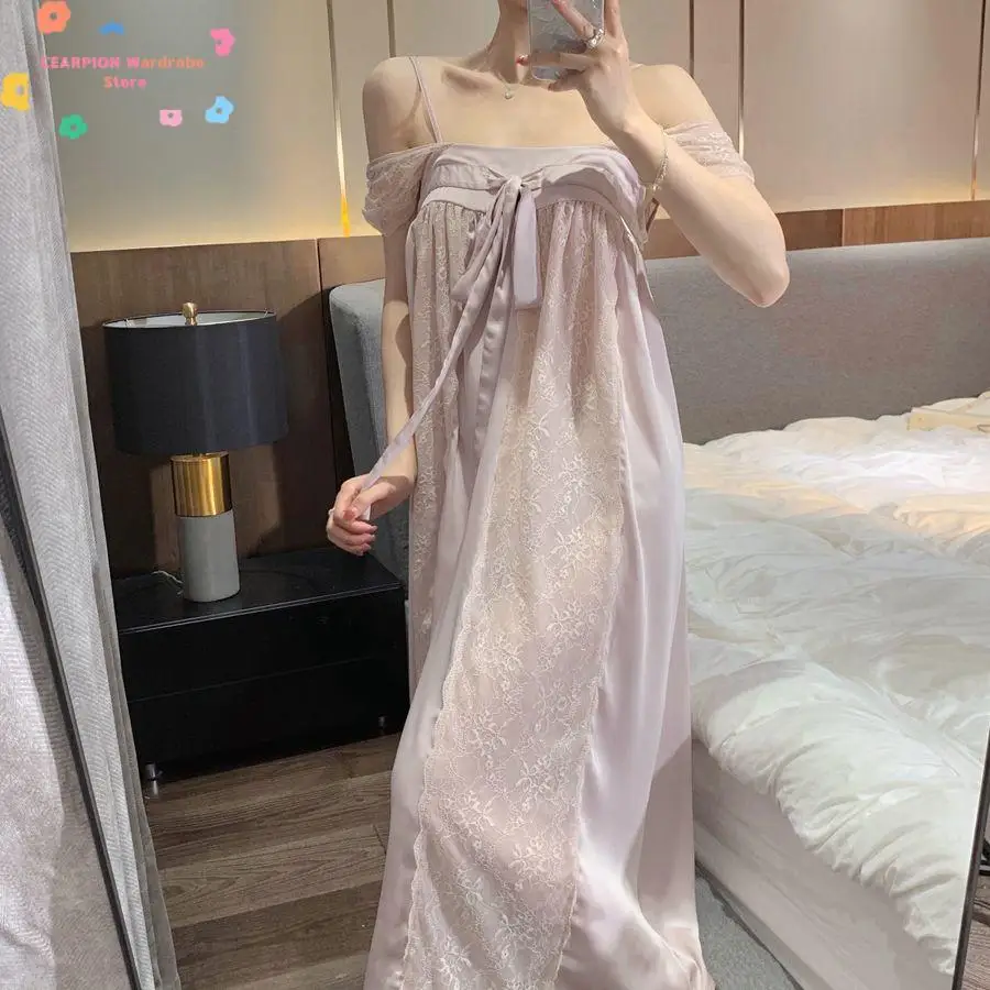 Женское Сетчатое платье принцессы на тонких бретельках, винтажная кружевная Домашняя одежда с вышивкой, Милая Ночная рубашка с бантом