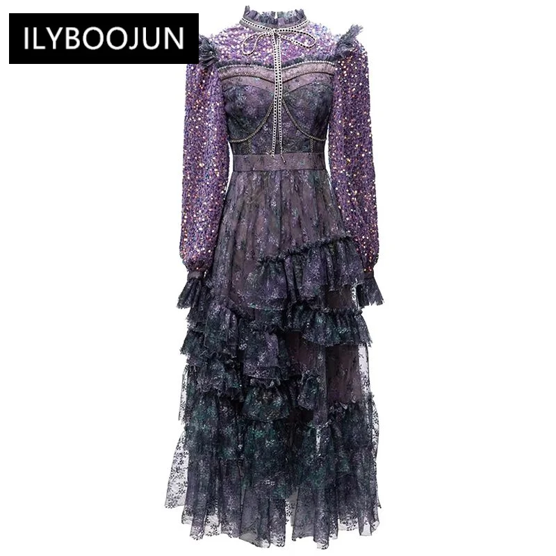 Женское Сетчатое платье с воротником-стойкой, лоскутное платье с рукавами-фонариками и оборками, платье с принтом и блестками, осень 2023