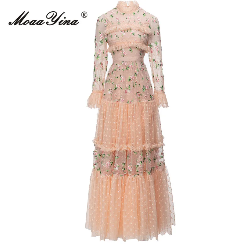 Женское Сетчатое платье MoaaYina, подиумное винтажное вечерние платье с рукавами-фонариками и кружевной вышивкой, облегающее длинное платье с высокой талией