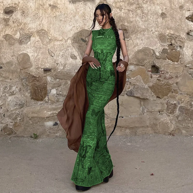 Женское ажурное длинное вечернее платье макси с высокой талией и принтом, элегантное облегающее платье без рукавов с круглым вырезом, лето ...