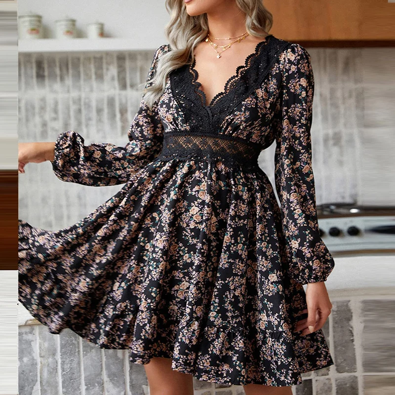 Женское ажурное мини-платье, Привлекательное платье с глубоким V-образным вырезом, модное платье с кружевной отделкой и принтом, женские тем...