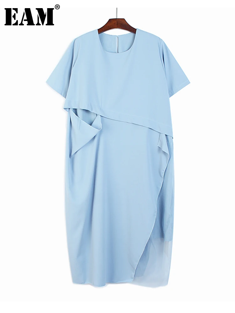 Женское асимметричное длинное платье EAM, синее Сетчатое платье с круглым вырезом и коротким рукавом, весна-лето 2022, 1DE8866