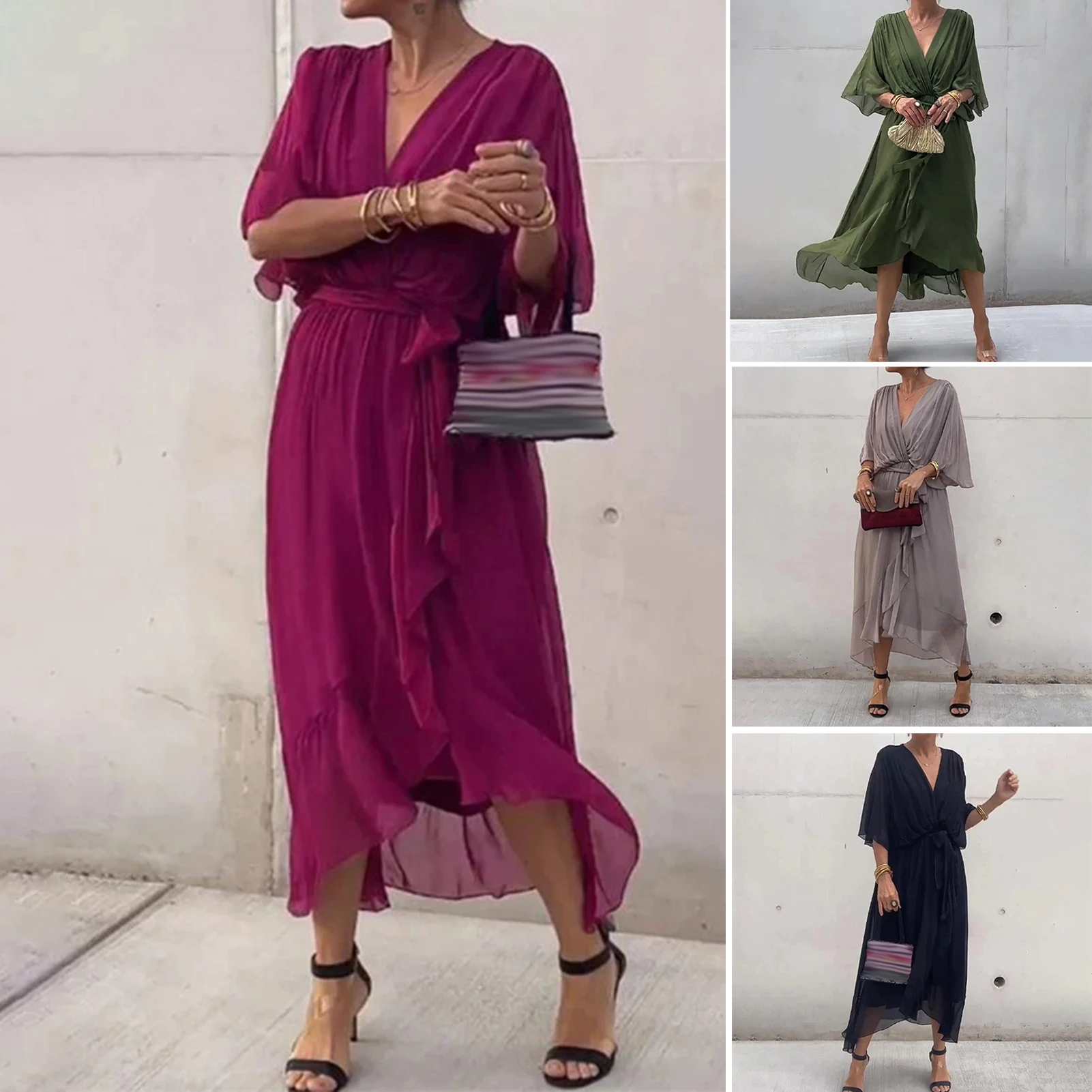 Женское асимметричное свободное платье-миди с круглым вырезом и коротким рукавом