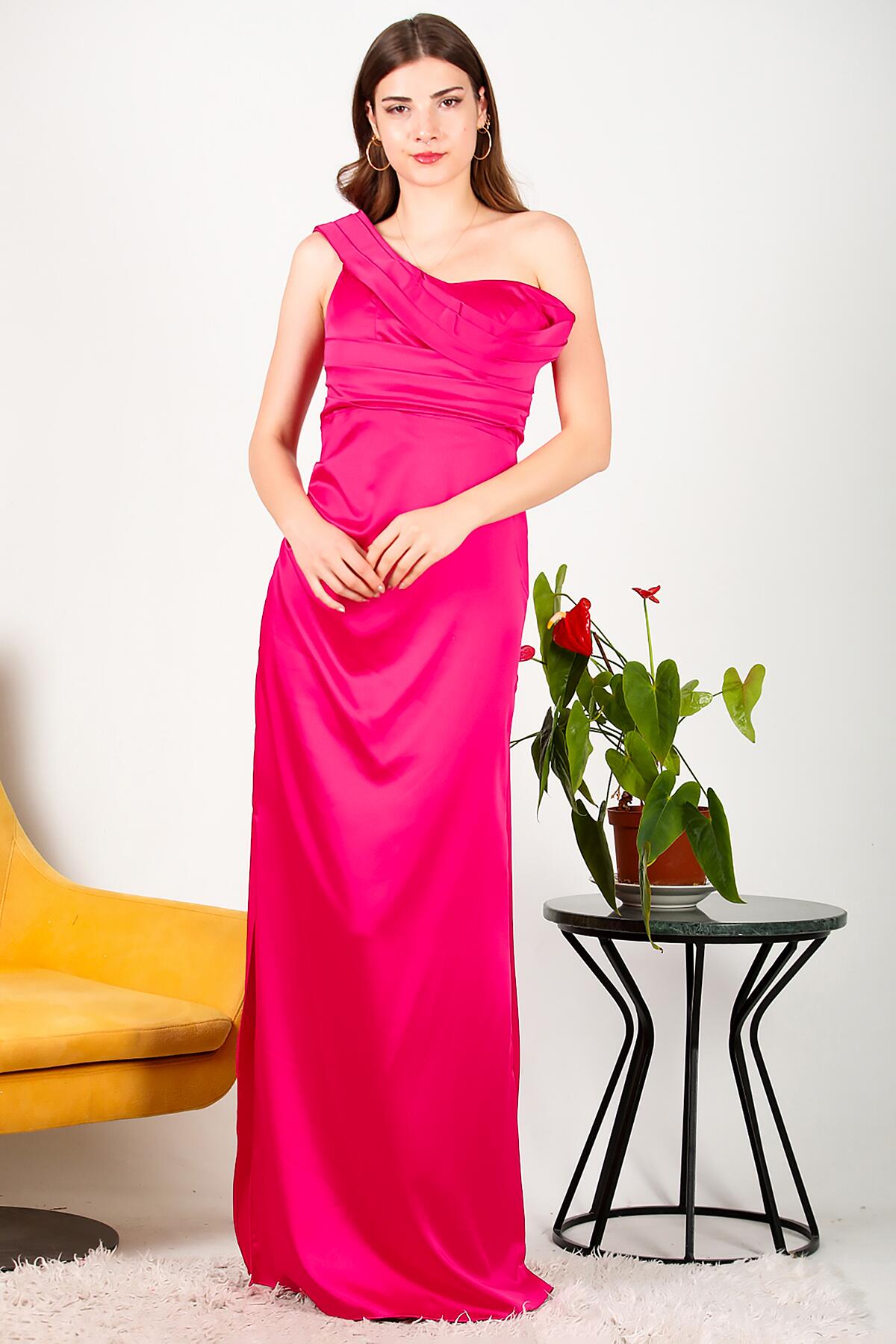 Женское атласное вечернее платье на одно плечо 42 фуксия