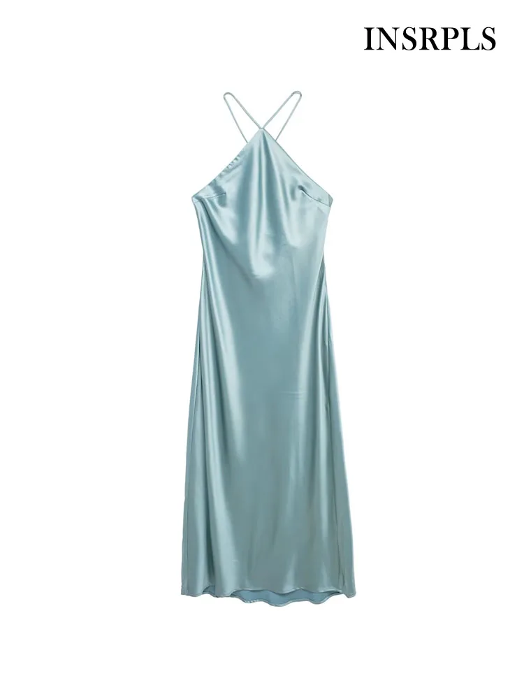 Женское атласное платье-миди с открытой спиной, на тонких бретелях