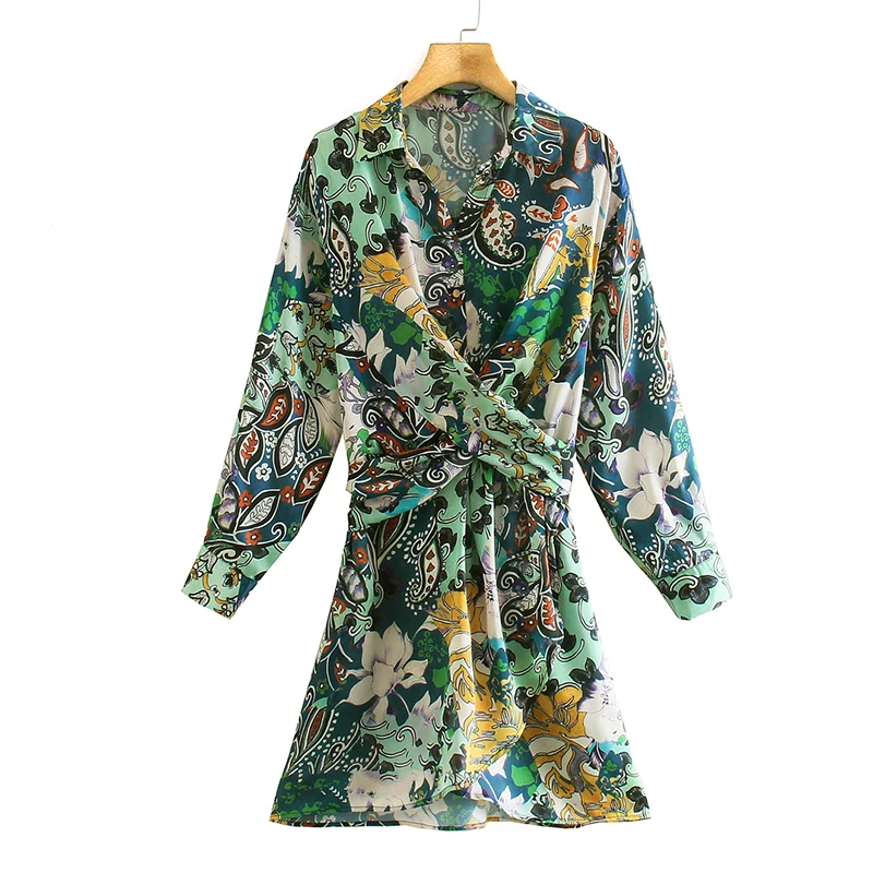 Женское атласное платье-рубашка составного кроя с длинным рукавом и поясом