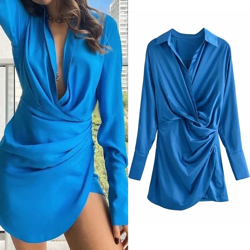 Женское атласное платье-рубашка Za, голубое короткое вечернее платье с запахом, длинным рукавом и рюшами, лето 2021
