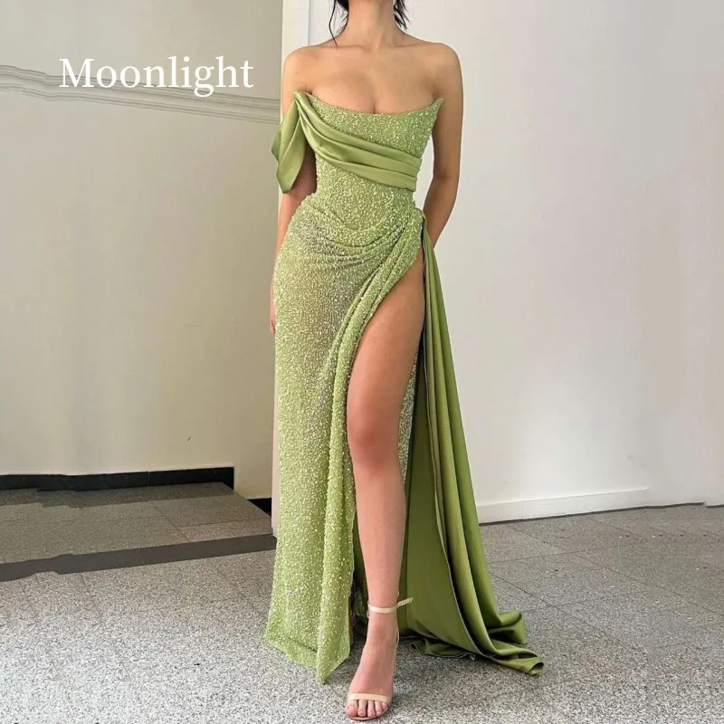 Женское атласное платье-русалка, с открытыми плечами, разрезом сбоку и блестками
