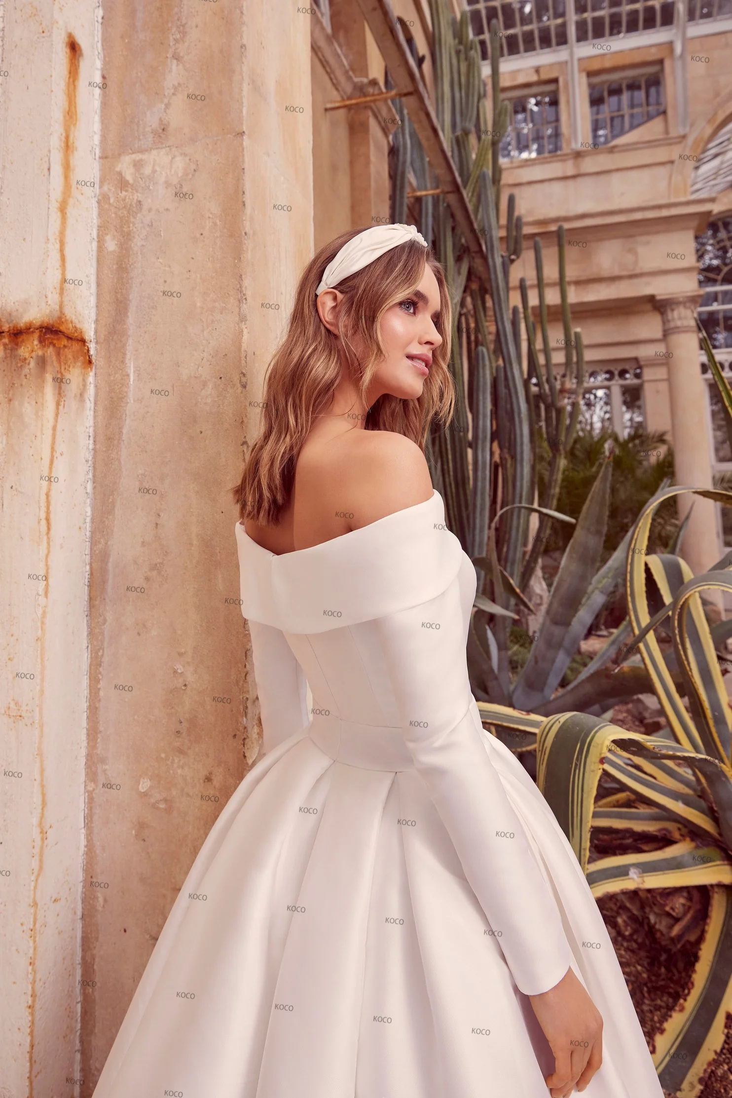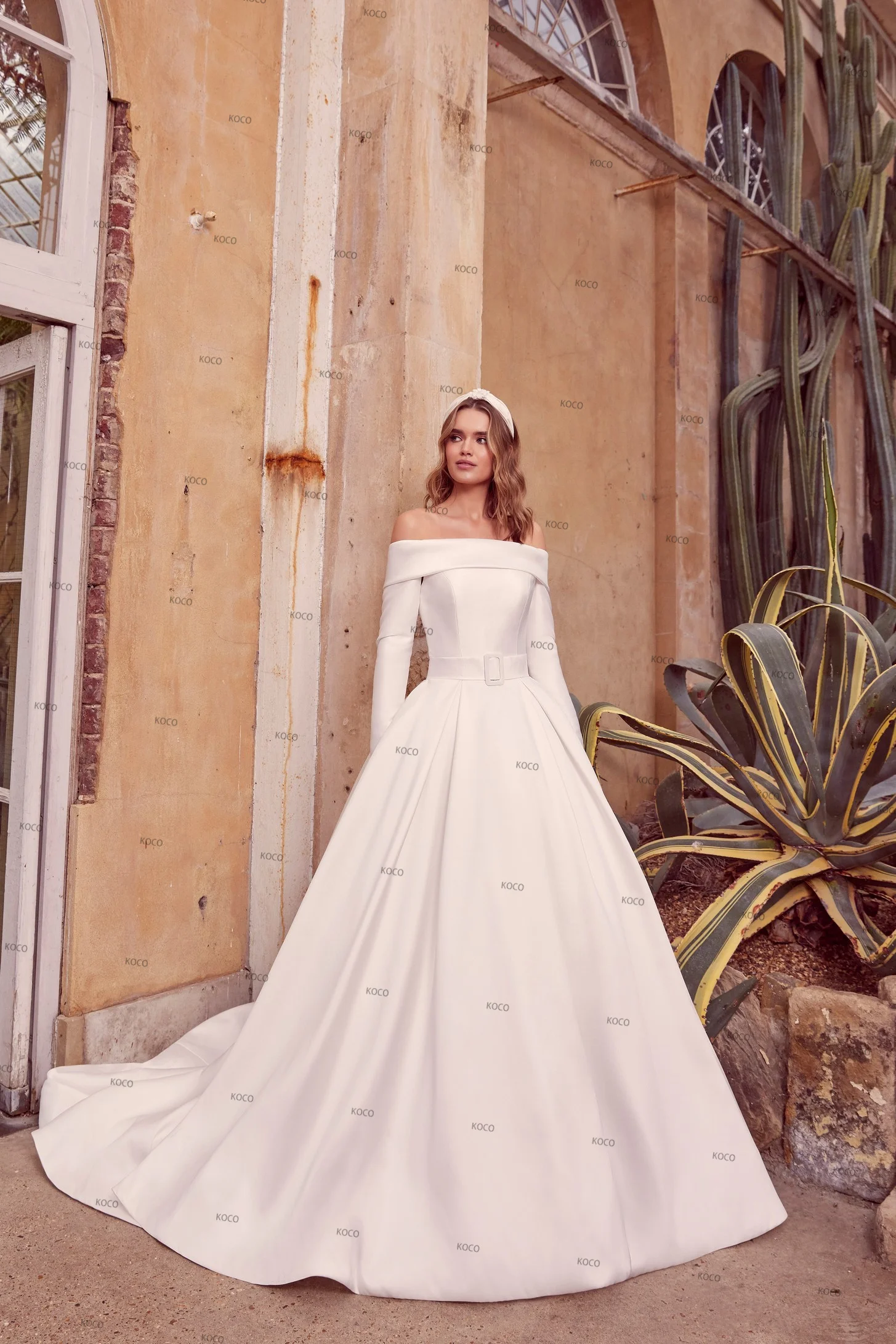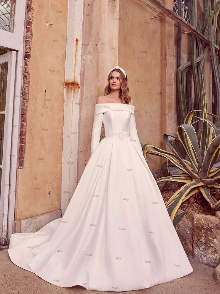 Женское атласное платье с длинным рукавом, вырезом лодочкой и шлейфом