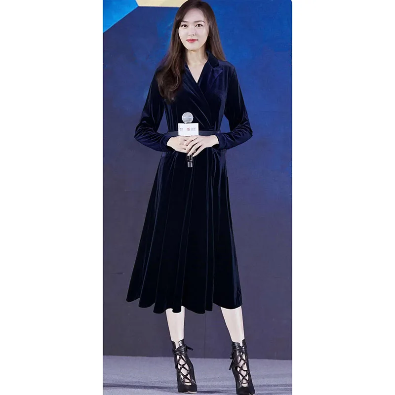 Женское бархатное платье с длинным рукавом, элегантное модельное однотонное платье с отложным воротником, NP1783MF