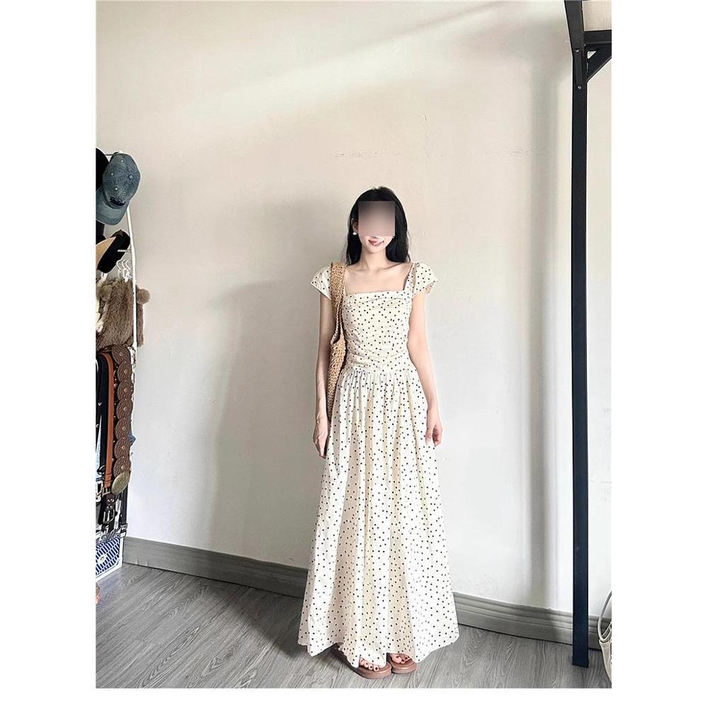 Женское белое платье макси в горошек с пышными рукавами во французском стиле - Летняя мода, Дизайн с акцентом на талии XL (for 55-60 kg)