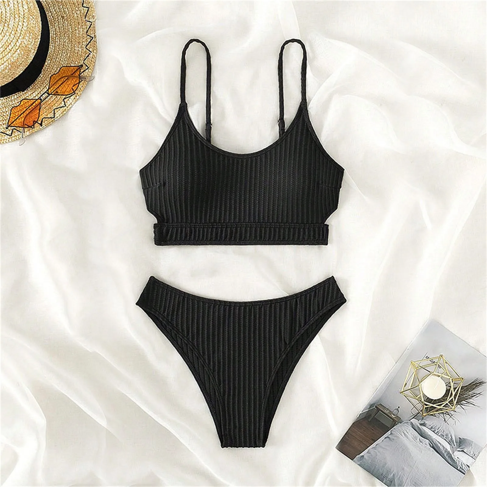 Женское бикини с высокой талией, однотонный костюм бикини с бюстом, купальник из 2 предметов, спортивные шорты для плавания для женщин с карманами