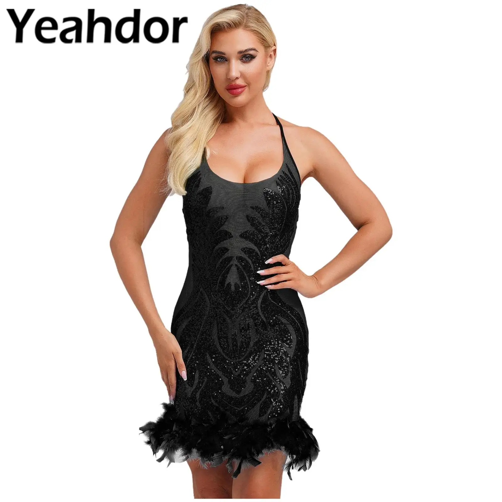 Женское блестящее вечернее коктейльное платье, женское платье с лямкой на шее, прозрачное сетчатое облегающее платье с перьями и подолом, расшитое блестками платье для латинских танцев ча-ча