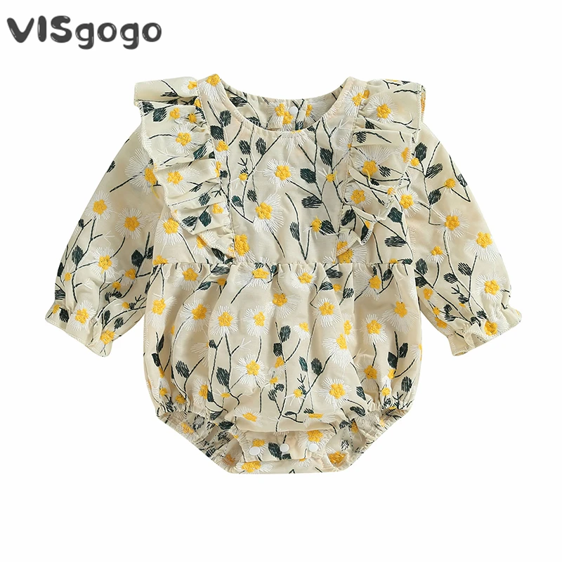 Женское боди с длинным рукавом VISgogo, Осенний комбидресс с оборками и цветочной вышивкой, комбинезон для новорожденных 0-18 месяцев