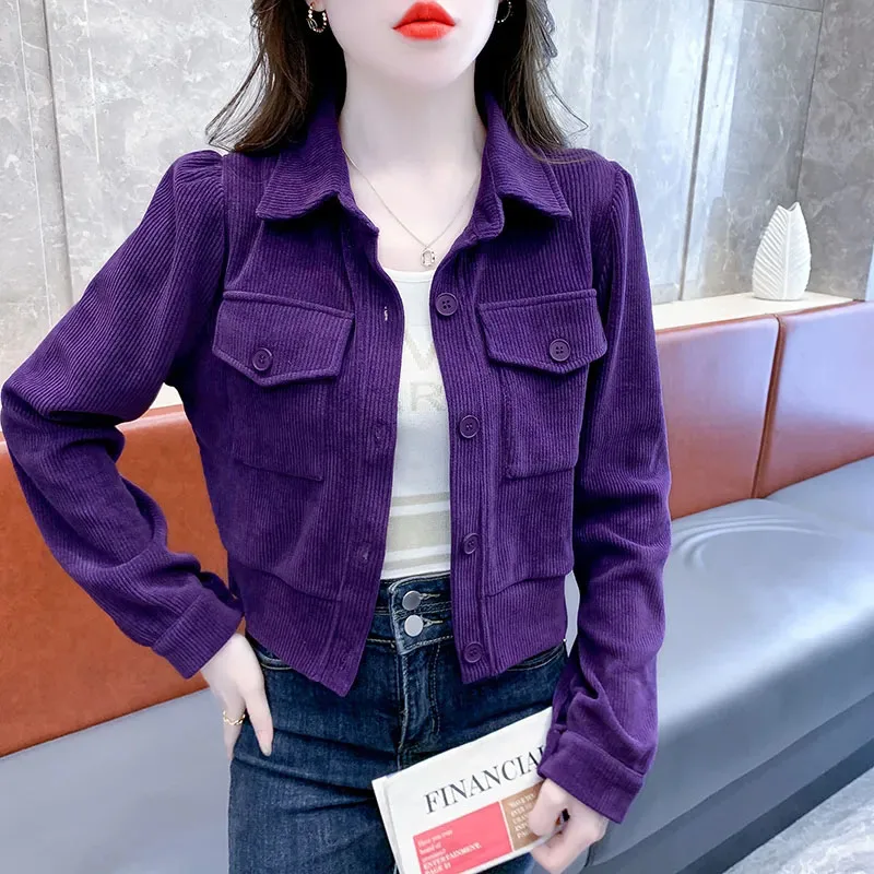 Женское вельветовое пальто, короткий кардиган, повседневная верхняя одежда, однобортный, цвета хаки, фиолетовый, 3XL, весна-осень