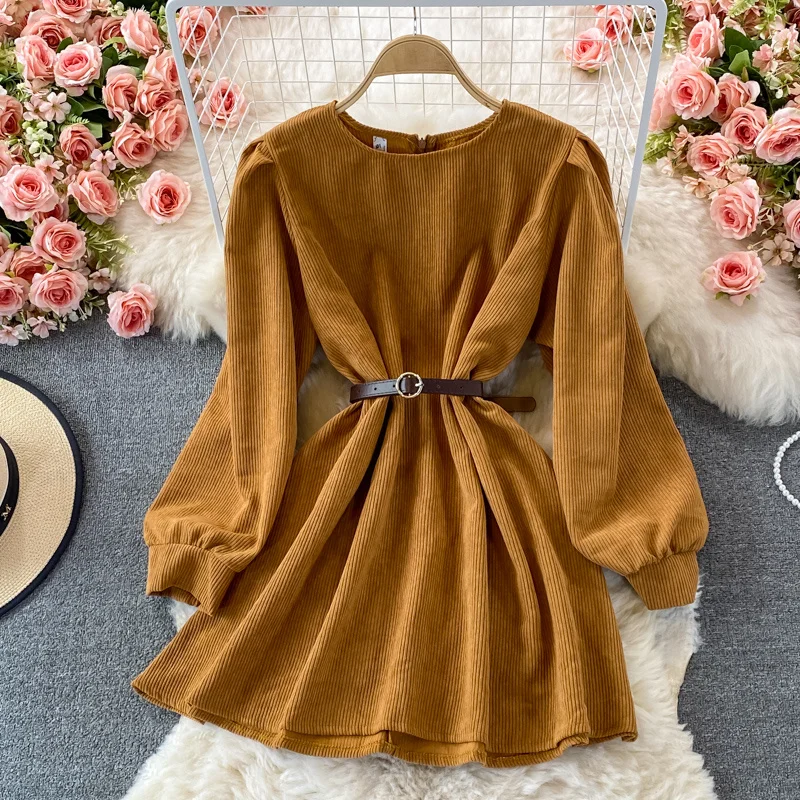 Женское вельветовое платье с рукавами-фонариками и завышенной талией