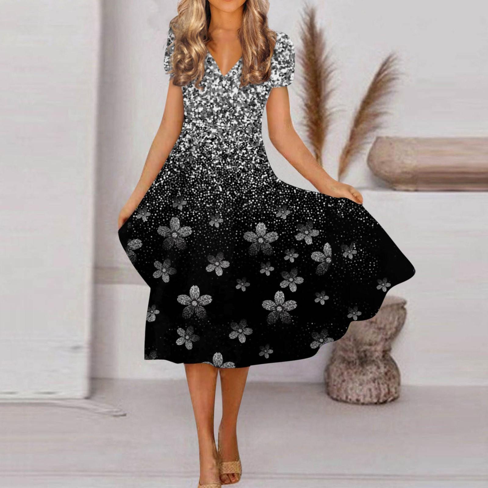 Женское весенне-летнее модное платье с V-образным вырезом и коротким рукавом с цветочным принтом и свободным подолом XXXXL чёрный