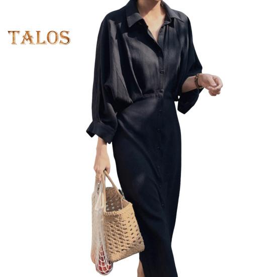 Женское весенне-осеннее платье, однотонное однобортное платье со свободными лацканами, мягкое плиссированное платье макси в стиле ретро с длинными рукавами и длинными рукавами L чёрный