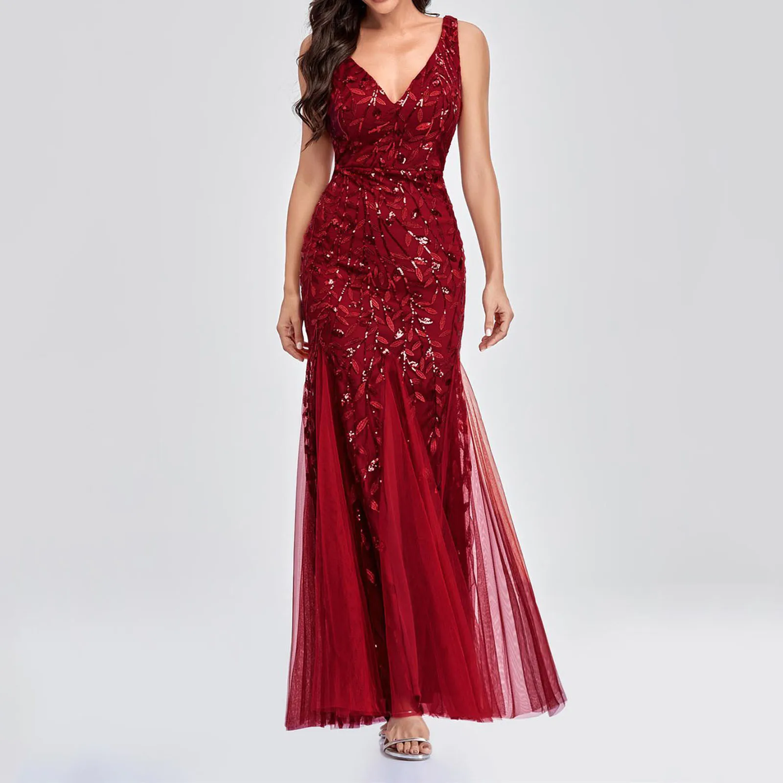 Женское вечернее платье без рукавов, с V-образным вырезом и блестками