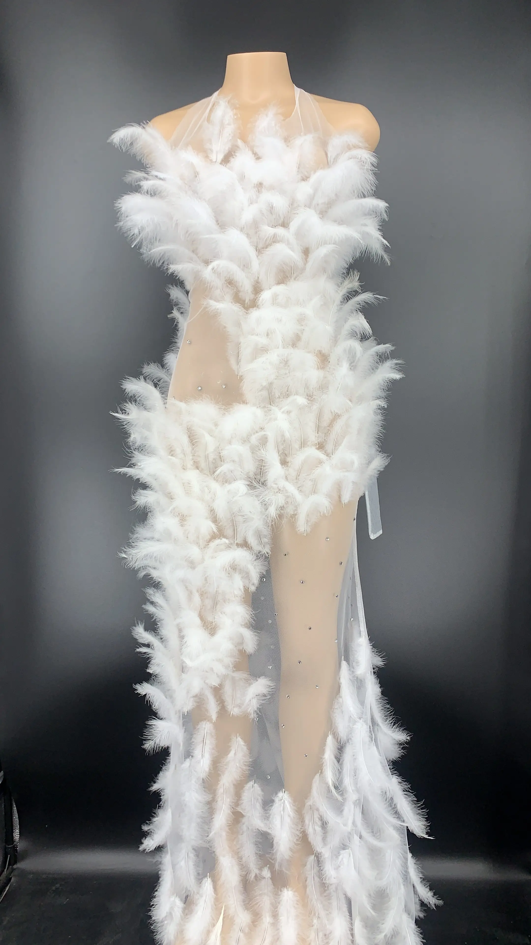 Женское вечернее платье на свадьбу, день рождения, сексуальные Стразы, прозрачное Сетчатое длинное платье с белыми перьями, одежда для сцены