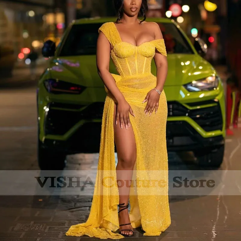 Женское вечернее платье-русалка, золотистое платье с открытыми плечами и разрезом, модель 2023 года
