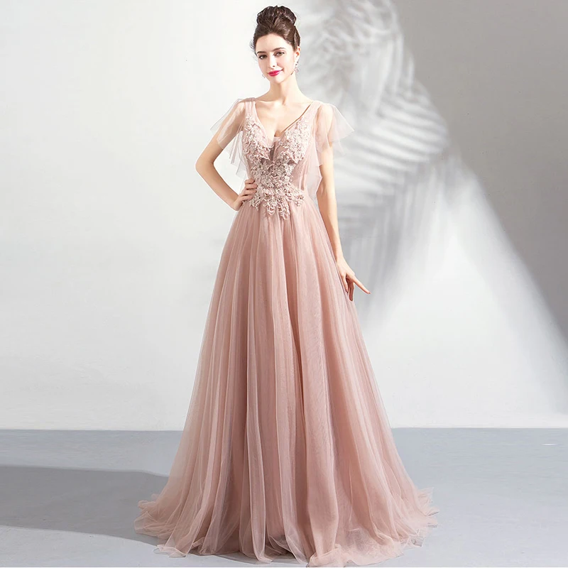 Женское вечернее платье с аппликацией и V-образным вырезом