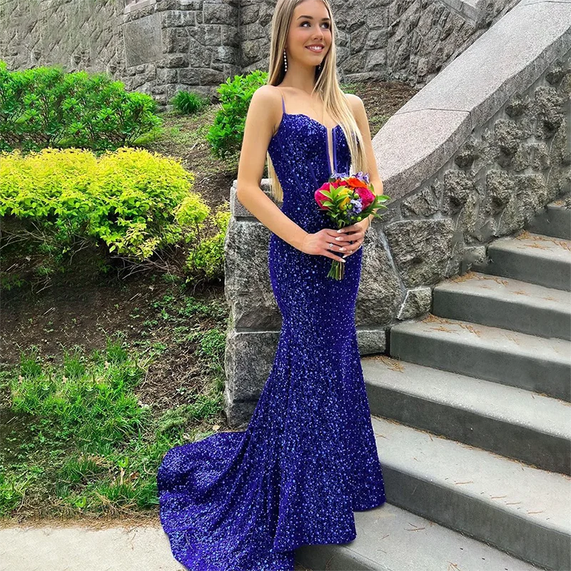 Женское вечернее платье с разрезом, голубое блестящее платье со шлейфом