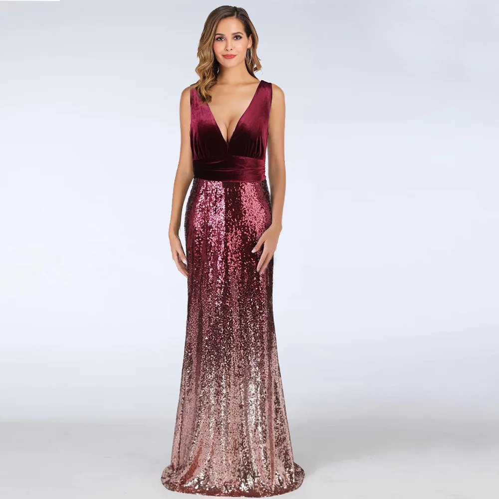 Женское вечернее платье с юбкой годе, розовое платье до пола с V-образным вырезом и блестками, лето 2019