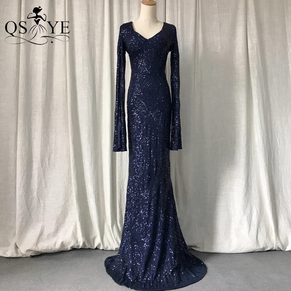 Женское вечернее платье с юбкой годе, темно-синее платье с блестками и длинными рукавами-фонариками, платье для выпускного вечера с V-образным вырезом и сетчатым узором, лето 2019
