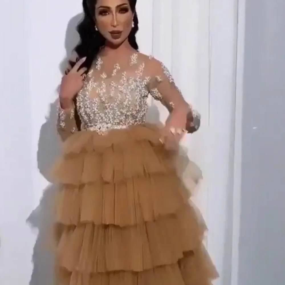 Женское вечернее платье цвета шампанского, прозрачное Тюлевое платье с вырезом лодочкой, длинным рукавом, бусинами, блестками, кристаллами ...