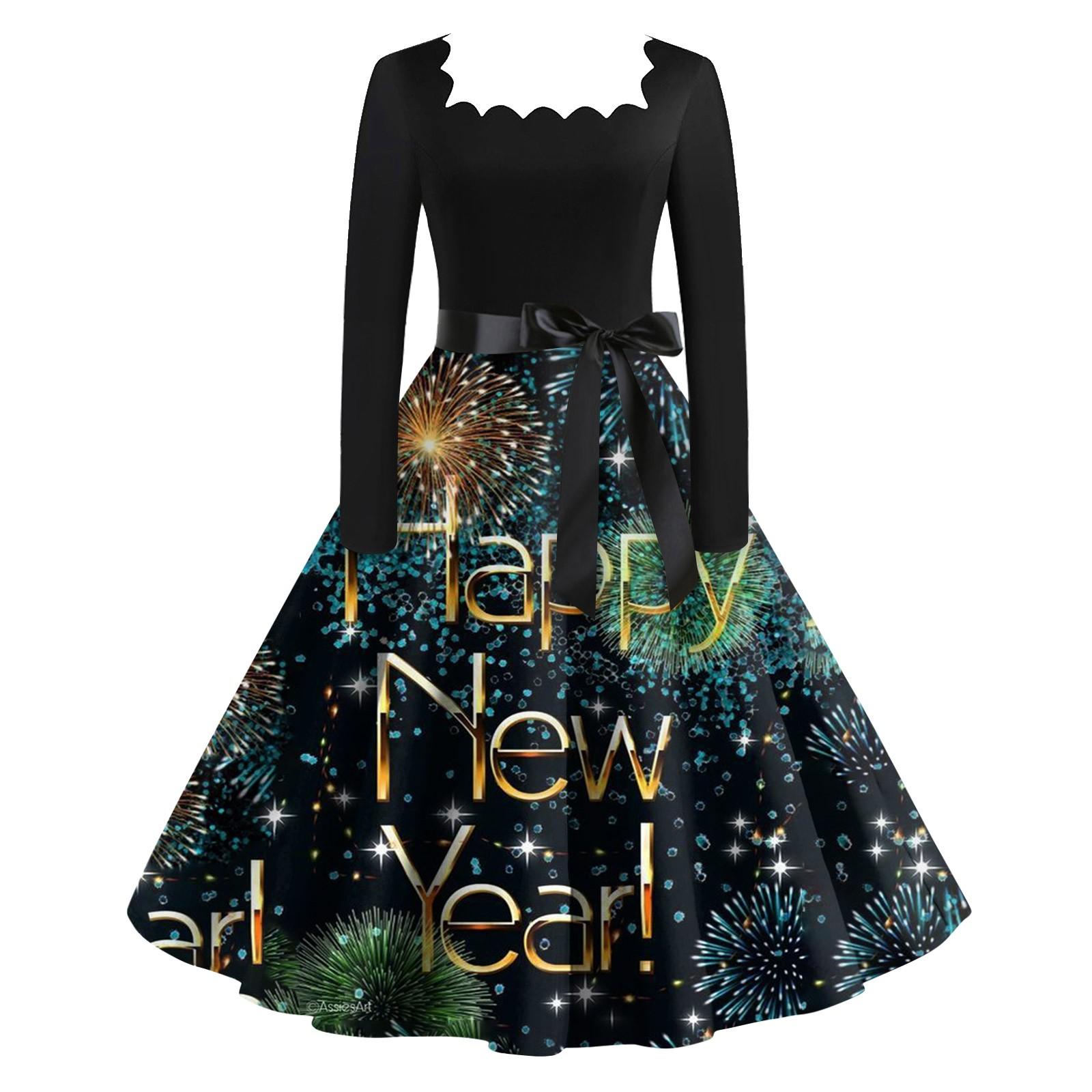 Женское винтажное классическое платье с длинным рукавом 2024, новогоднее свободное платье с квадратным вырезом и принтом M синий