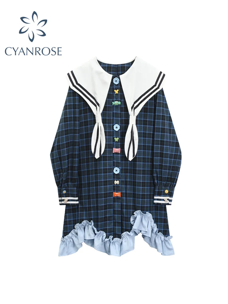 Женское винтажное клетчатое лоскутное платье с матросским воротником, однобортное элегантное платье с длинным рукавом, повседневное прост...