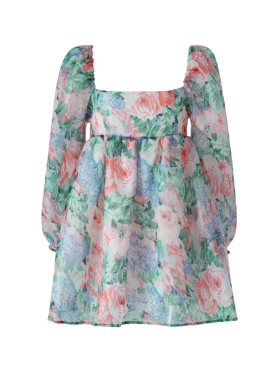 Женское винтажное мини-платье с цветочным принтом, с пышными рукавами и квадратным вырезом