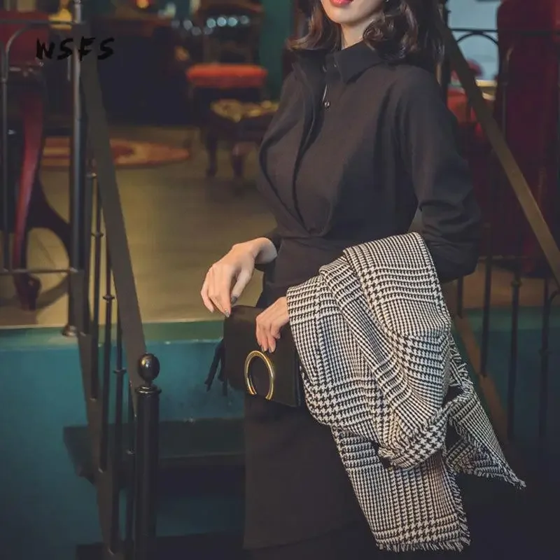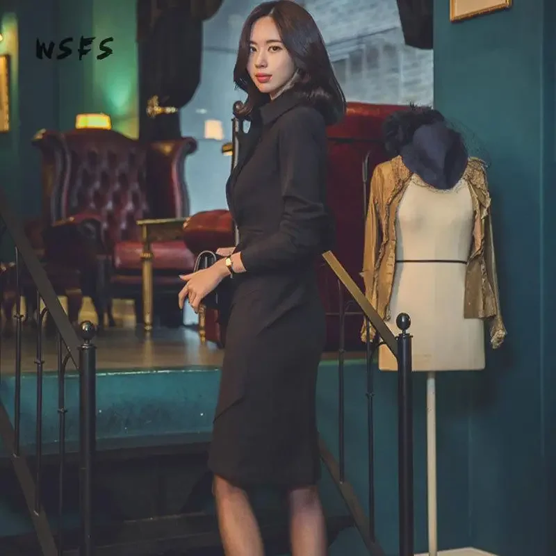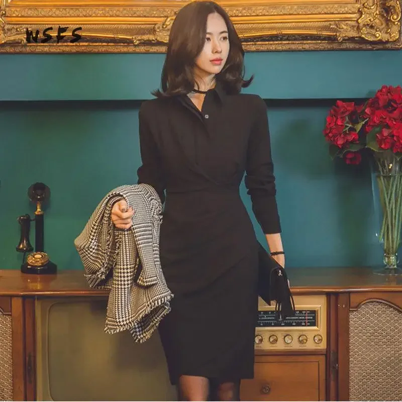 Женское винтажное платье-карандаш с отложным воротником и длинным рукавом
