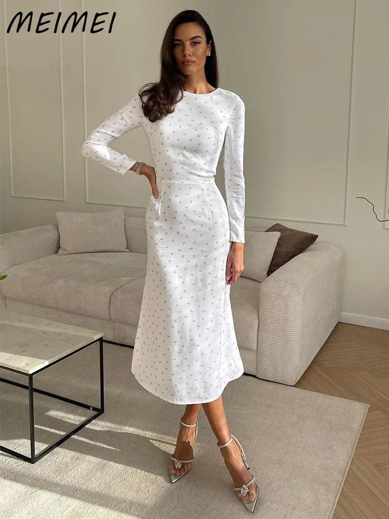 Женское винтажное платье-миди с круглым вырезом, длинным рукавом и цветами
