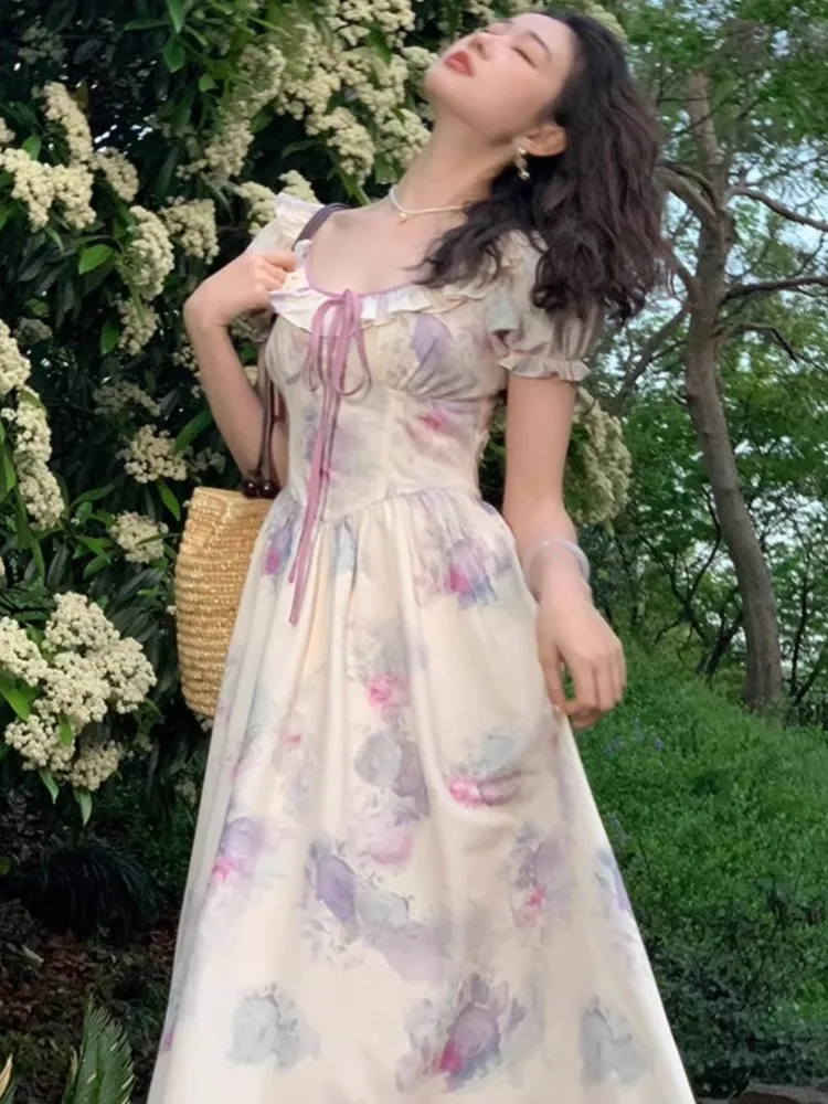 Женское винтажное платье миди, платье с принтом, круглым вырезом и пышными рукавами, на шнуровке, одежда для лета, 2023
