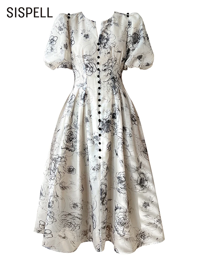 Женское винтажное платье миди SISPELL, платье с V-образным вырезом, пышными рукавами, высокой талией и принтом, летнее платье с цветными блоками