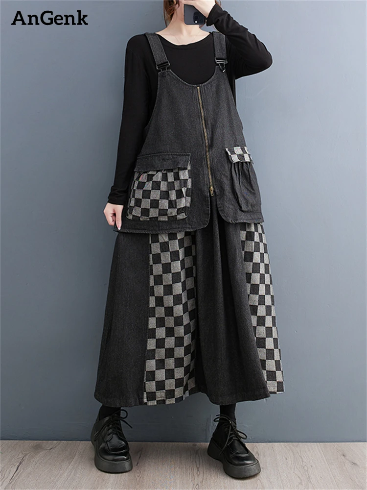 Женское винтажное платье на тонких бретельках, повседневное длинное джинсовое платье в клетку, весна-осень 2023