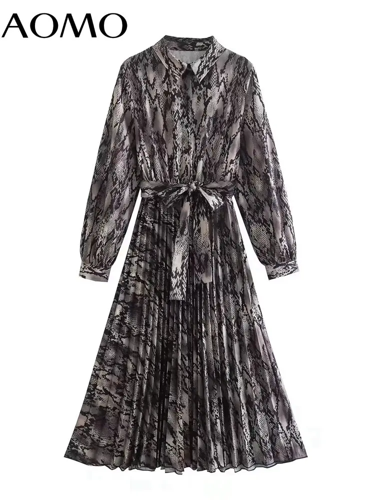 Женское винтажное платье со змеиным принтом, длинным рукавом и поясом