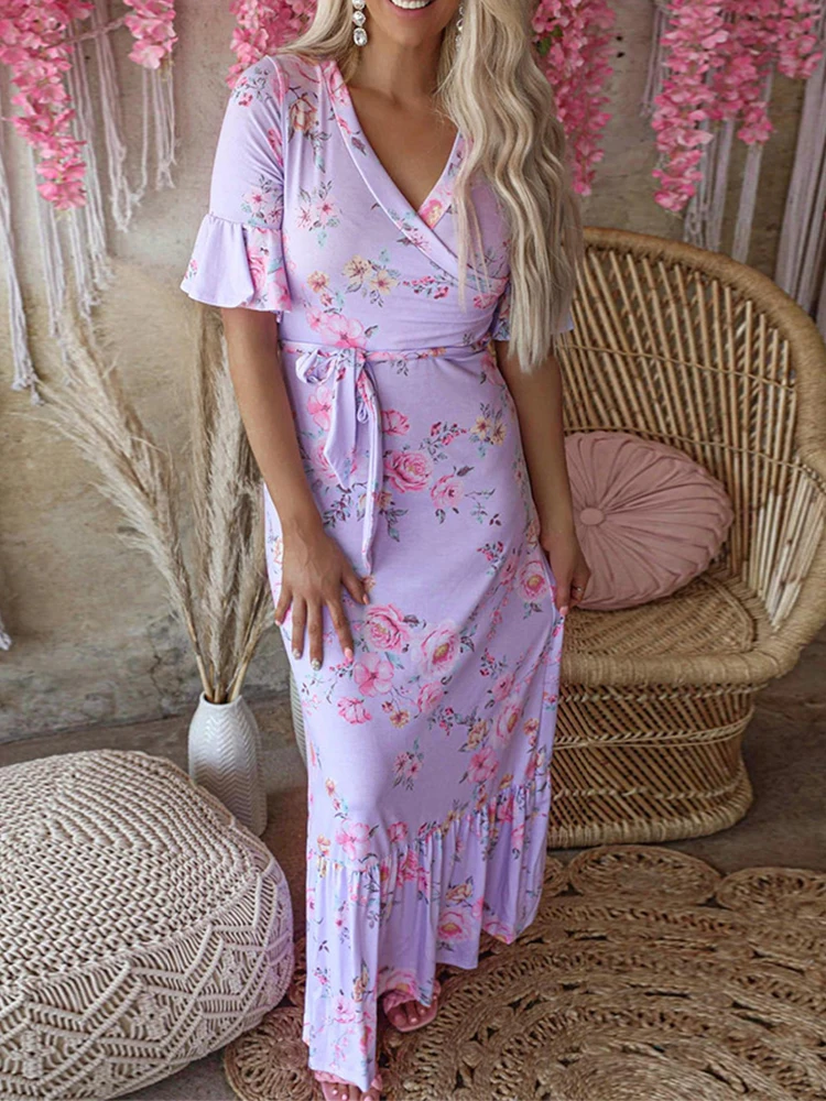 Женское винтажное платье с запахом, Элегантное Длинное платье с цветочным принтом, V-образным вырезом и поясом, облегающее летнее повседнев...