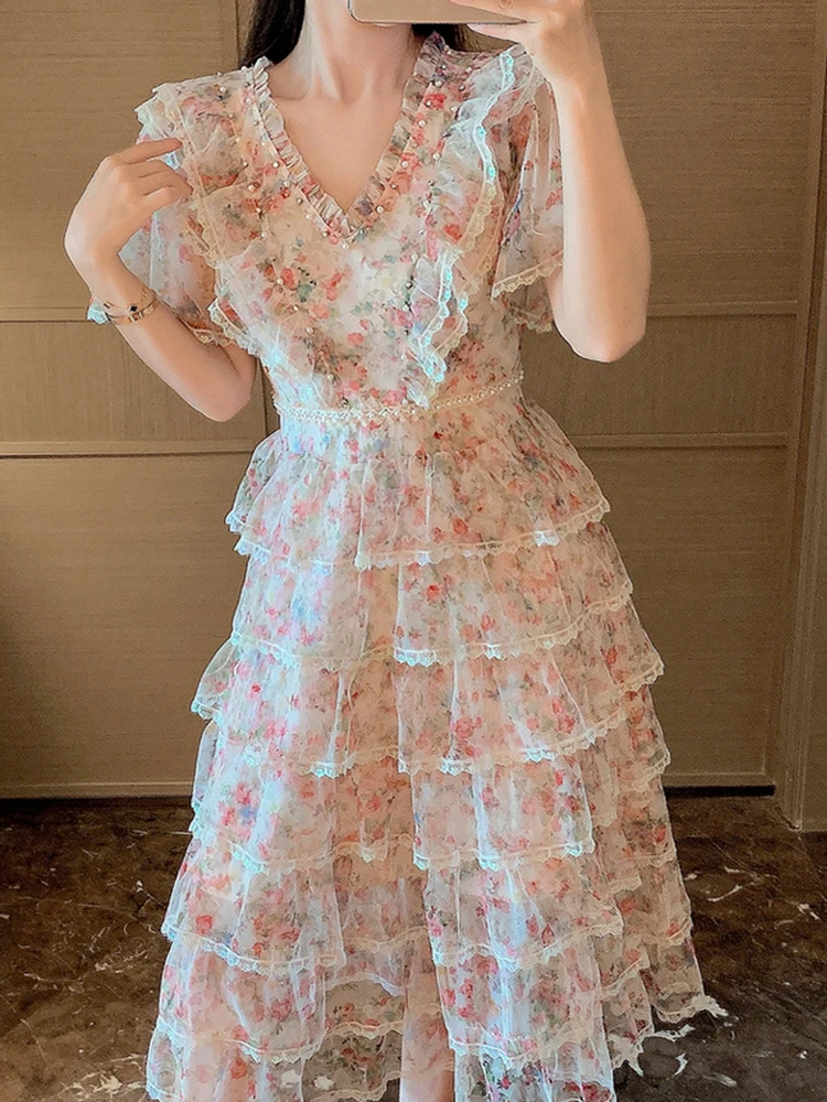 Женское винтажное платье с каскадными оборками, привлекательное приталенное платье с цветочным принтом, расшитое бисером, во французском стиле, Новинка лета 2023