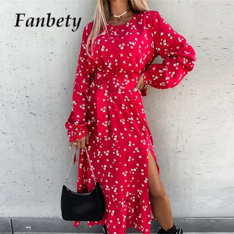 Женское винтажное платье с цветочным принтом, круглым вырезом и длинным рукавом