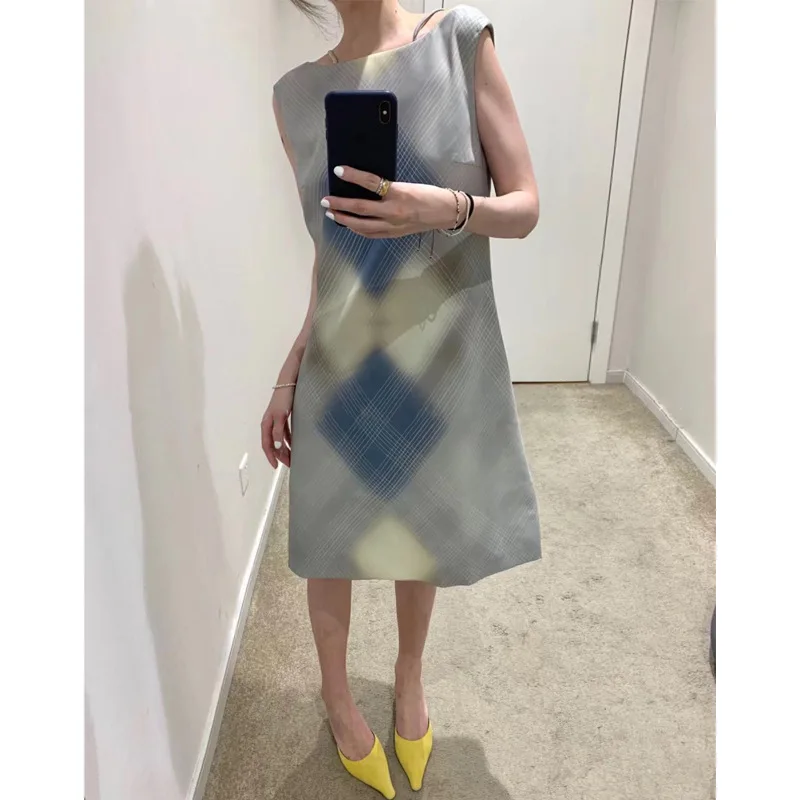 Женское винтажное платье-трапеция, серое и синее клетчатое платье без рукавов, с открытой спиной и кулиской на весну и лето