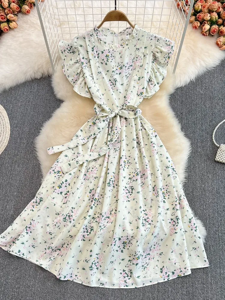 TWOTWINSTYLE Patchwork Ruffles Mesh Long Dresses For Women Round Neck Flying Sleeve High Waist Elegant Dress Female Fashion 2023