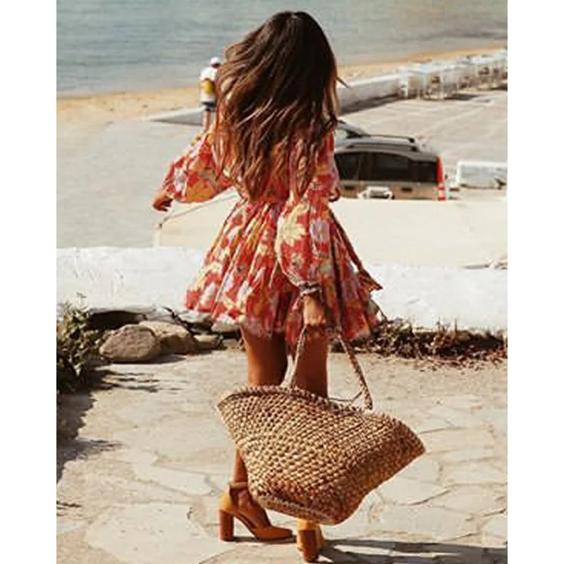 Женское винтажное пляжное платье с цветочным принтом и длинным рукавом